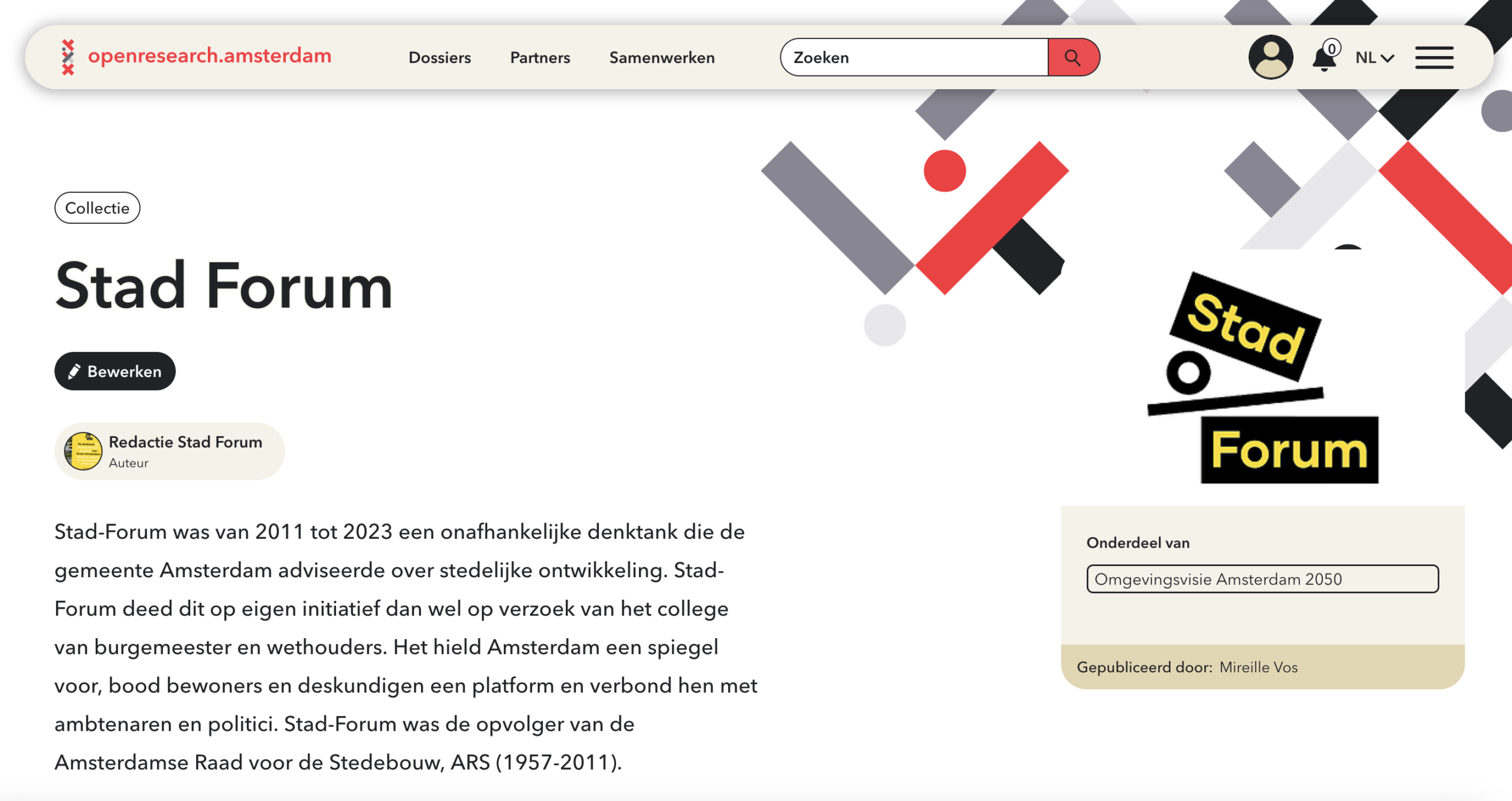 Wat was Stad-Forum? Stad-Forum was van 2011 tot 2023 een onafhankelijke denktank die de gemeente Amsterdam adviseerde over stedelijke ontwikkeling. Stad-Forum deed dit op eigen initiatief en op verzoek van het college van burgemeester en wethouders. Het hield Amsterdam een spiegel voor, bood bewoners en deskundigen een platform en verbond hen met ambtenaren en politici. Stad-Forum was de opvolger van de Amsterdamse Raad voor de Stedebouw (1957-2011).